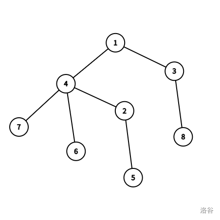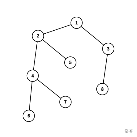 这是一只可爱的树。现在,我们算完了满足 $lca(u,v) = 2$ 的路径的贡献。假设我们现在要算以 1 为根的子树内的贡献。我们找到 1 的子树的重心,也就是 3。我们现在去算 3 的贡献。