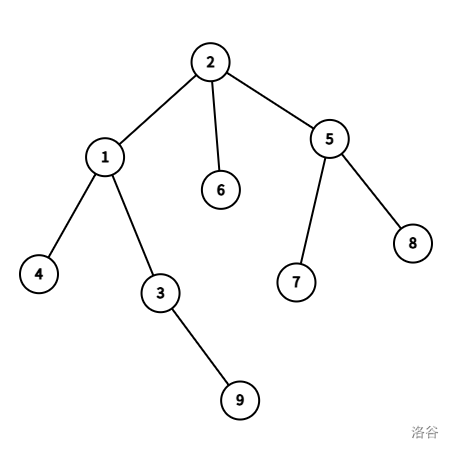 性质 1 可以让很多暴力在点分树上有一个优秀的复杂度。回到本题。以刚才那棵树为例。比如说我们要求出到 5 距离小于等于 2 的点个数。那么根据性质 2,我们可以枚举 5 在点分树上的的祖先。比如我们在枚举 4,我们只要求出 $\sum_{lca(u,5) = 4 \land dist(5,4) + dist(4,u) \le k} value_u$。其中 $dist$ 表示两点在原树上的距离。对于 $\sum$ 中的第一条限制 $lca(u,5) = 4$,我们可以先求出满足 $u$ 在 4 的子树内的 $u$ 的 $value$ 和,然后减去满足 $u$ 在 2 的子树内的和,这样就通过容斥算出正确答案了。我们对于每个点维护两颗平衡树,一颗维护 $x$ 的子树内每个点到 $x$ 的距离和 $value$,一颗维护 $x$ 的子树内每个点到 $fa_x$ 的距离和 $value$。这样就可以查询和修改了。复杂度是单次操作 $\log^2 n$ 的。