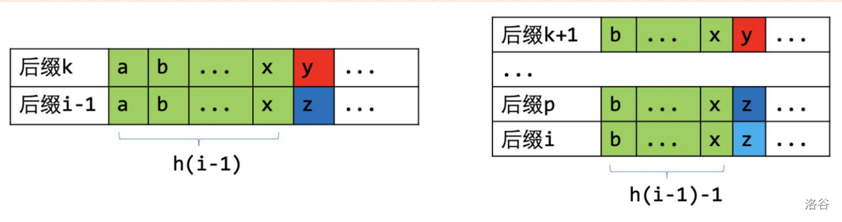 注意到上一个式子相当于 $i$ 开始的后缀的 $height$ 一定大于等于 $i - 1$ 开始的 $height - 1$。如上面那张图,$i$ 开始的后缀就是 $i - 1$ 开始的后缀删掉前面一个字符。那么 $i$ 的前继后缀一定只比 $i - 1$ 的前继后缀少一个最前面的字符。所以就有了上面那个性质。
